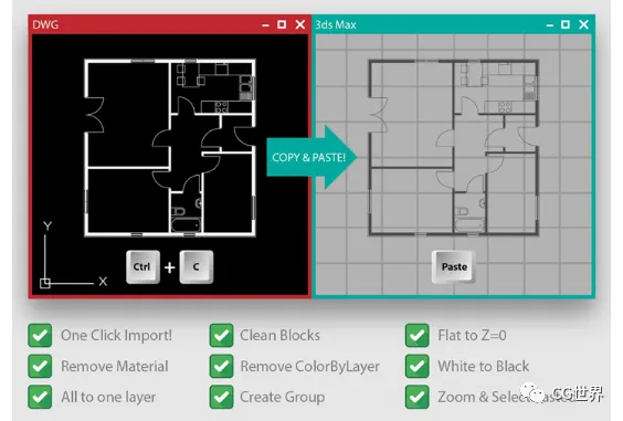 Copy Paste DWG是一个用来加快日常建模工作的小插件,可以简单地将AutoCAD或DraftSight内容复制粘贴到3dsMax中,并在AutoCAD和DraftSight之前自动切换(功能不止于此)。