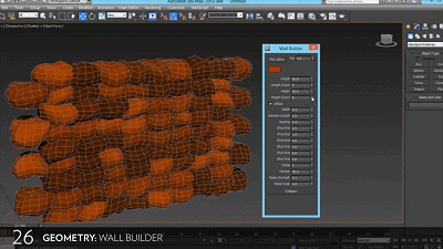 主要功能有:通过偏移将不同墙壁放在一起;按照样条创建墙壁;随机功能随机创建砖块;多维子对象随机颜色;可将所有砖体分开放置(模拟物理破坏),也可将墙壁塌陷成一个网格,还可利用布尔值创建墙洞或窗口等。