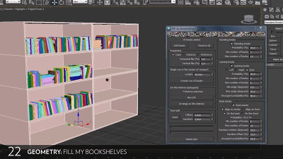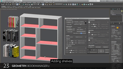 主要功能有水平、倾斜和翻转书籍;将书籍直接放在书架上,将书籍放置在阵列中;在视窗中编辑虚拟书架尺寸;具有通过对象名称或颜色快速定义的书籍系列;根据书架长度和深度的书籍对齐方式;书籍克隆、缩放选项;数量设置等。