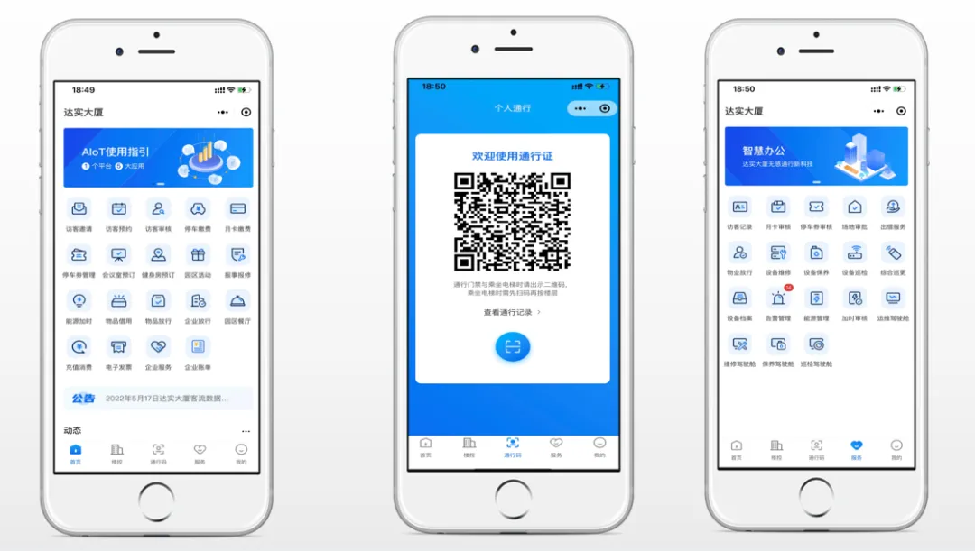 以AIoT为基础,以数据为枢纽,通过APP智能化场景打通楼宇中人、物、空间、设备之间的关系。