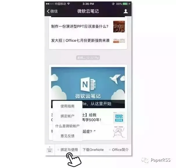 首先要关注“微软云笔记”公众号,进入公众号后,点击【绑定与使用】绑定微软账号。