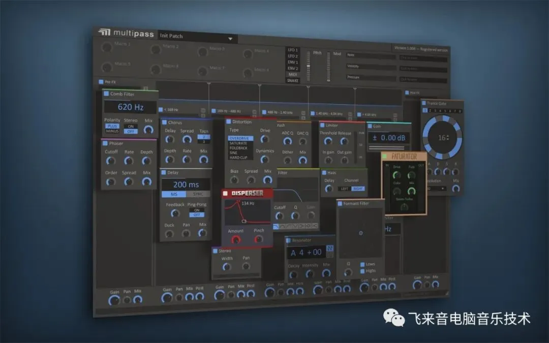 Multipass的一个神奇插件,可以将频率分割成5个频段,来使用Kilohearts自己的插件模块随意插入在任意频段进行处理。直接购买Multipass就可以使用基于所有模块的预置,但是调整模块上的参与则需要拥有该模块的授权才可以。无论如何,这都是非常具有开创性的创意,如果你想在效果链上有所突破,来试试这个真的不错!10月5日前,Multipass只卖4折仅需218元。