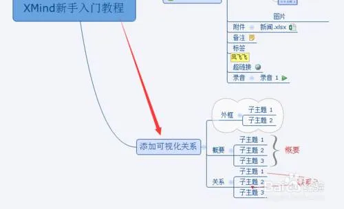 可视化关系主要有外框、概要和联系,为主题添加特殊标记来对主题进行编码和分类、使用箭头展现主题之间的关系和使用外框功能环绕主题组。主要通过快速访问工具栏三个图标进行。