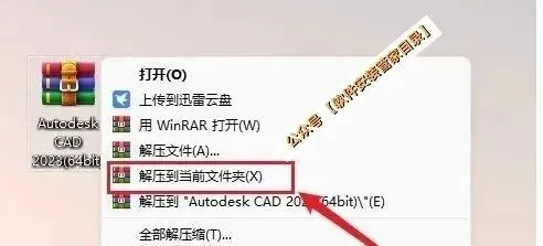 1.选中下载的【CAD2023(64bit)】压缩包,鼠标右击选择【解压到CAD2023(64bit)】。