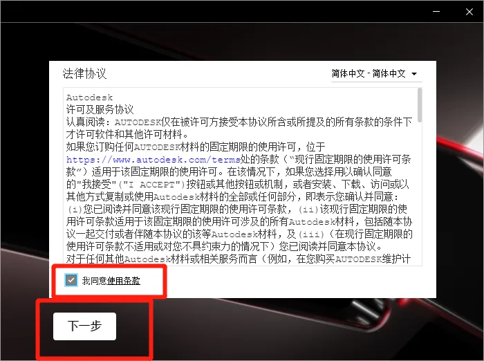 4.勾选【我同意使用条款】,然后点击【下一步】。