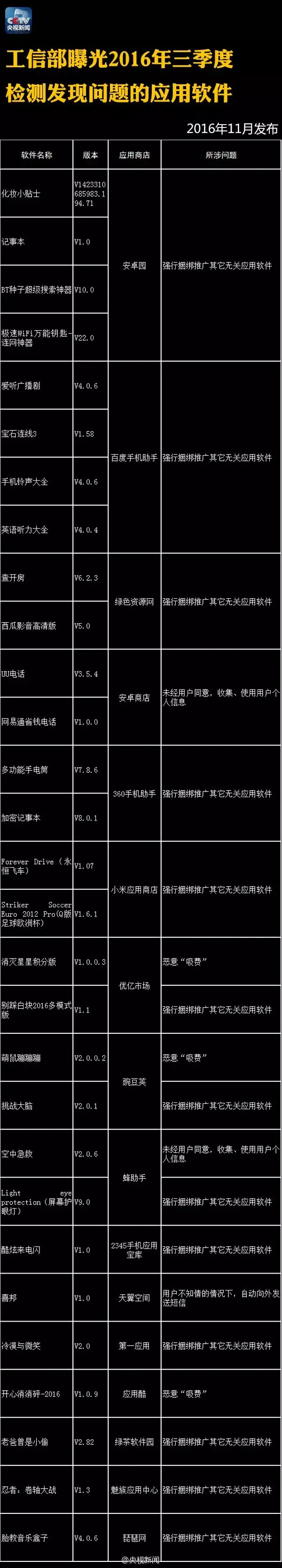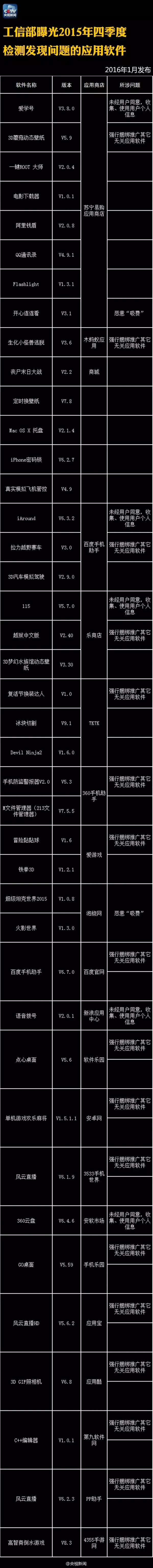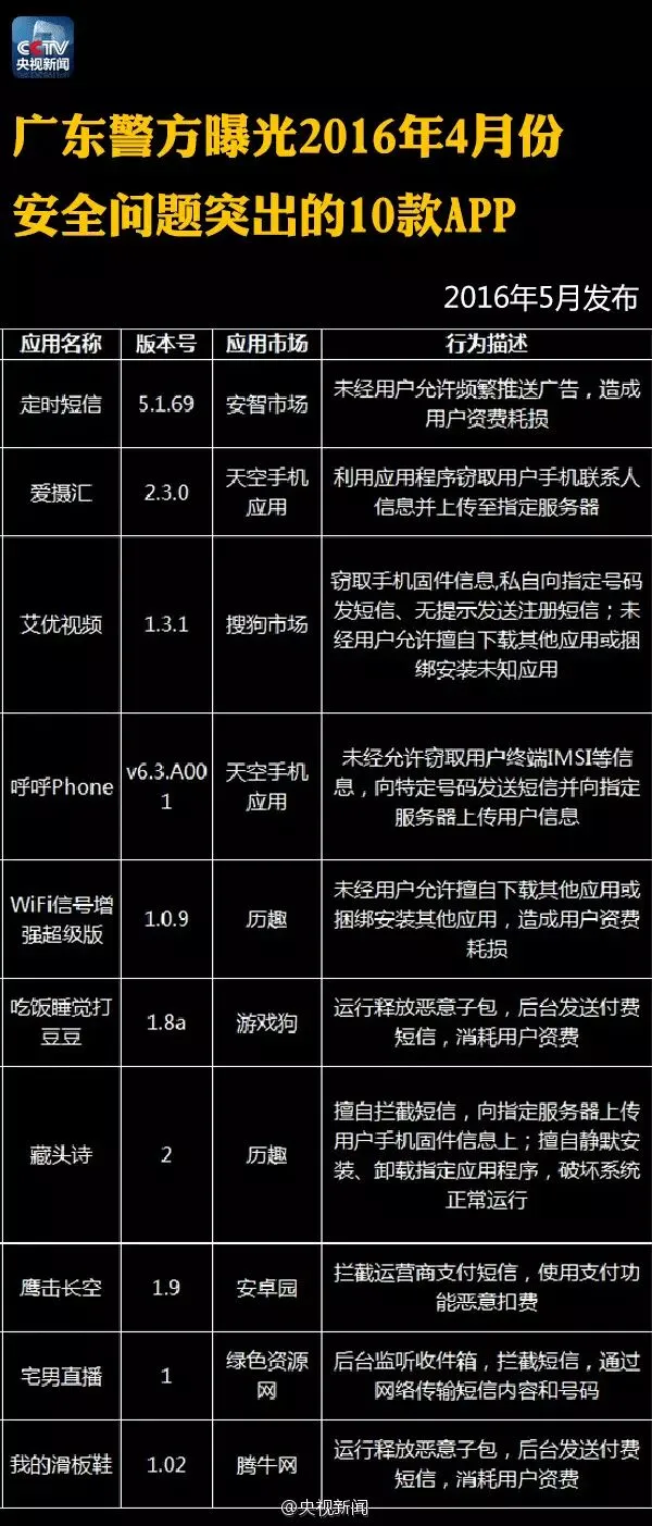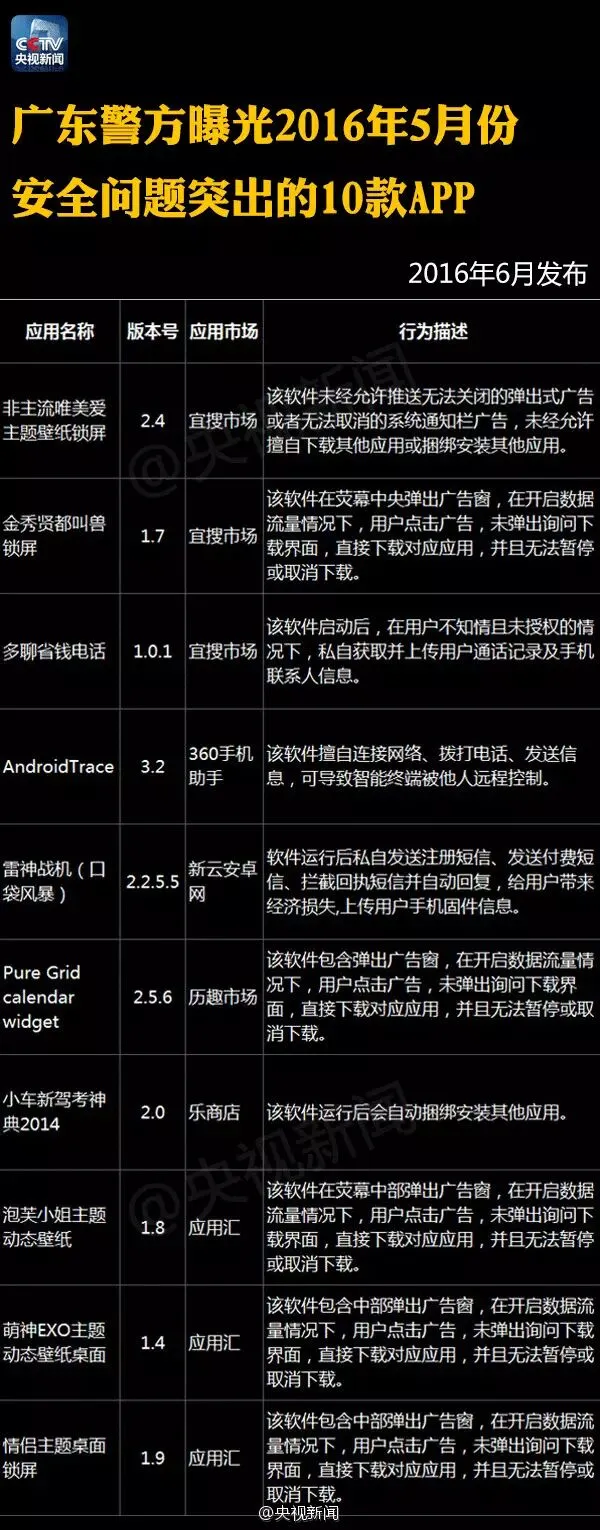 【提醒】这122个手机APP偷信息、偷钱!赶紧删除! 今年以来,工信部、广东省公安机关已连续曝光122款APP它们存在窃取用户信息、破坏数据、擅自使用付费业务、恶意推送广告等突出问题!戳图,转告亲朋,快卸载! 来源:央视新闻微博 本期编辑:崔鹏、胡程远 觉得不错,请点赞↓↓↓