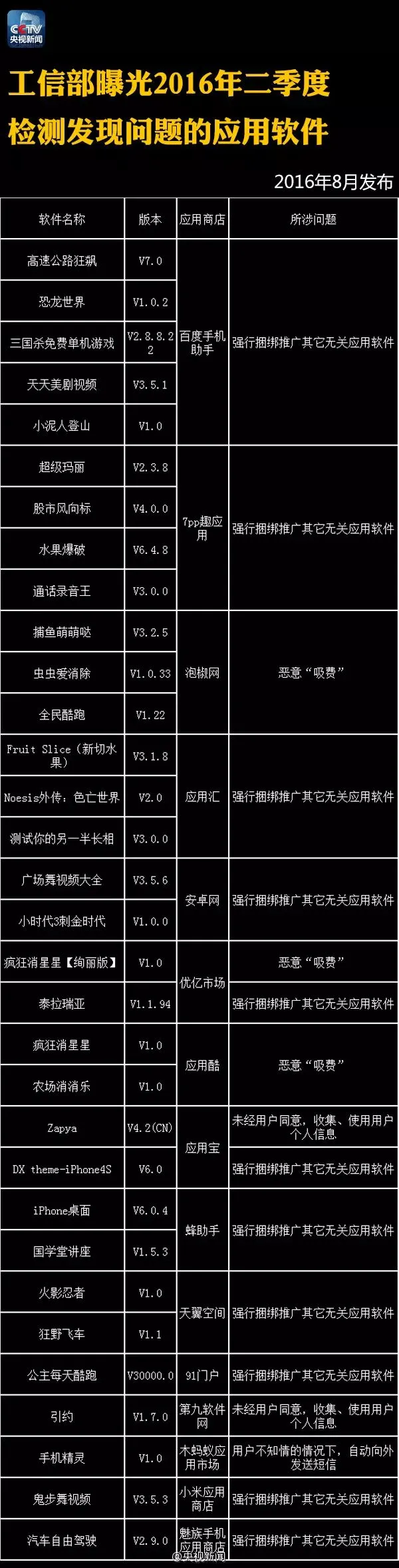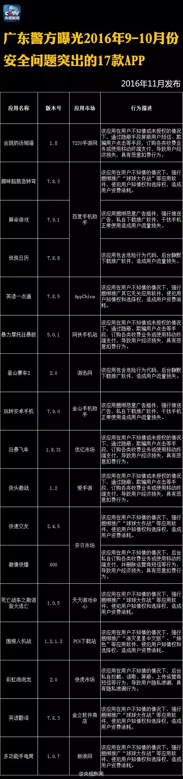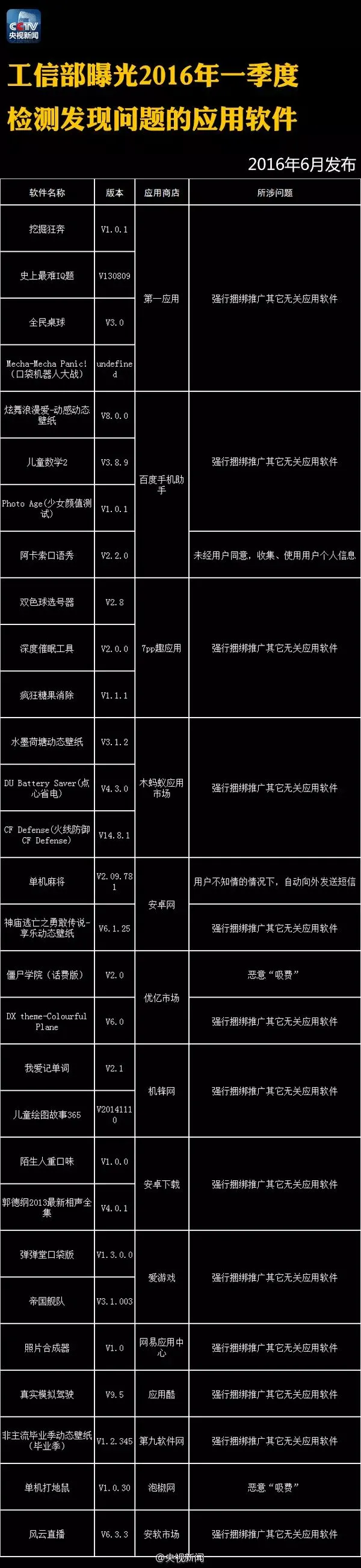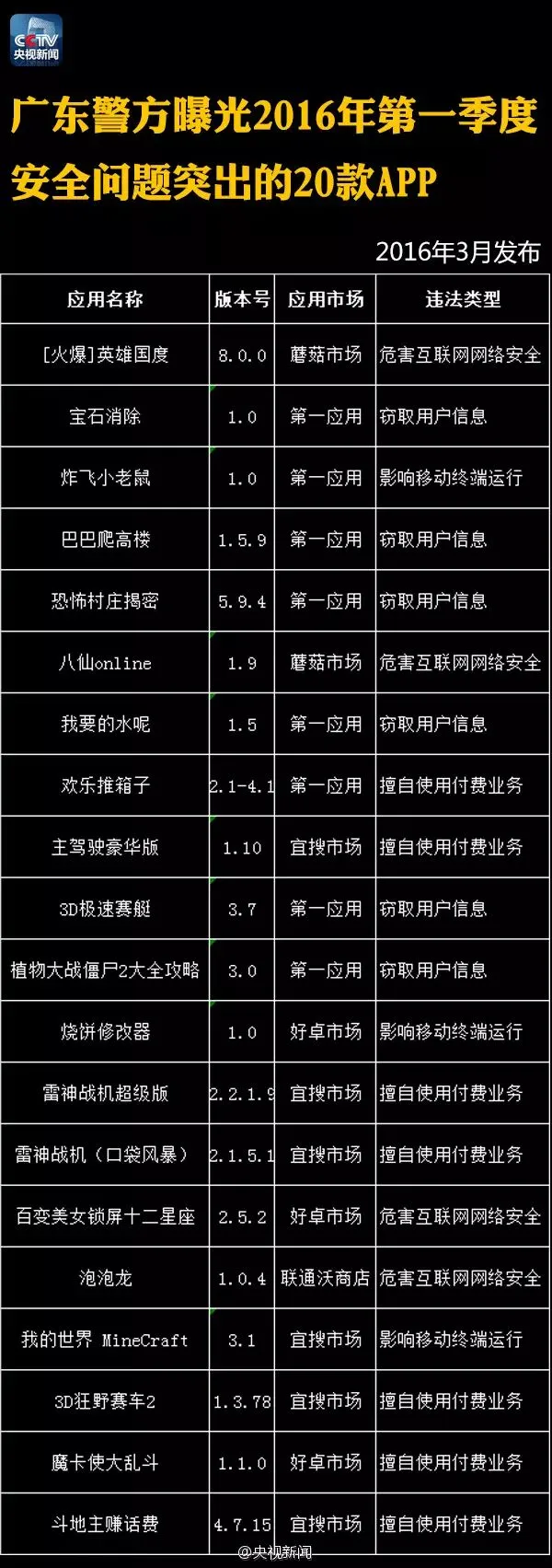 【提醒】这122个手机APP偷信息、偷钱!赶紧删除! 今年以来,工信部、广东省公安机关已连续曝光122款APP它们存在窃取用户信息、破坏数据、擅自使用付费业务、恶意推送广告等突出问题!戳图,转告亲朋,快卸载! 来源:央视新闻微博 本期编辑:崔鹏、胡程远 觉得不错,请点赞↓↓↓