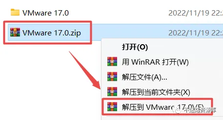1.选中下载的压缩包,然后鼠标右键选择解压到“VMware 17.0”(没有解压选项点这里)