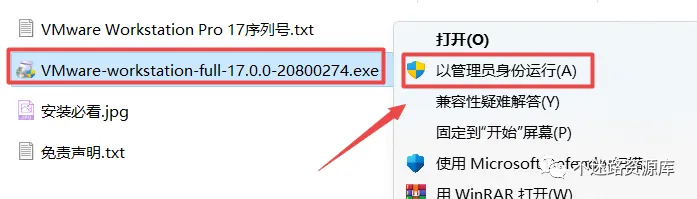 2.打开刚刚解压的文件夹,鼠标右键点击“VMware-workstation-full-17.0.0-20800274.exe”选择“以管理员身份运行”