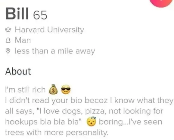 另一个假比尔·盖茨在个人简历上写着:“我仍然很有钱。我没看你的简介,因为我知道人人都会说,‘我喜欢狗,披萨,不**……也太无聊了……我想要更有个性的人。’