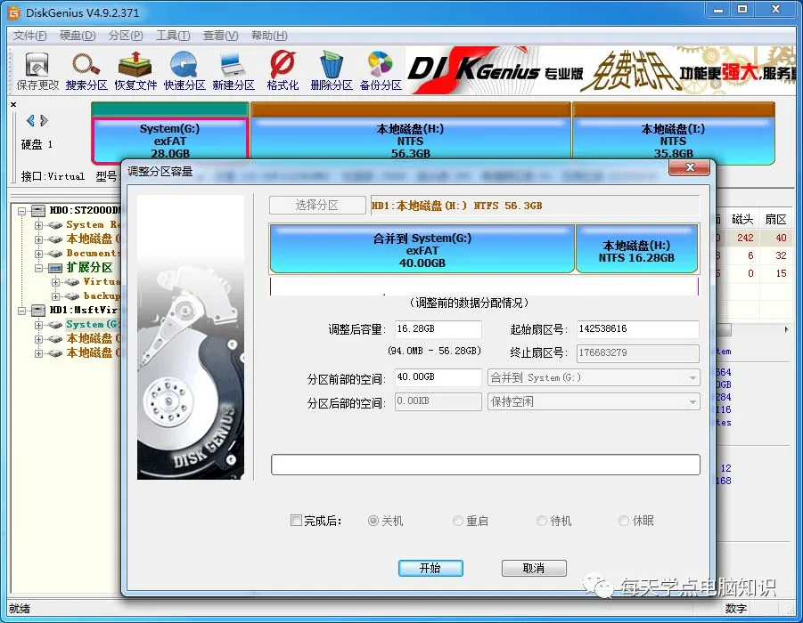 3. 在弹出的调整分区窗口上设置想要扩容的量,然后点击“开始”按钮。