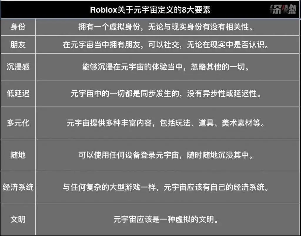 “元宇宙第一股”Roblox定义的元宇宙概念中,需要具备8个关键特征,分别为身份、社交、沉浸式体验、低延迟通信、多元化、随地、经济系统以及文明。