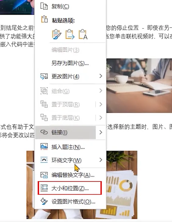 ❶ 首先,选中一个图片,右键,找到【大小和位置】