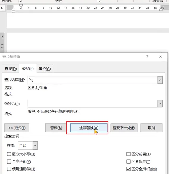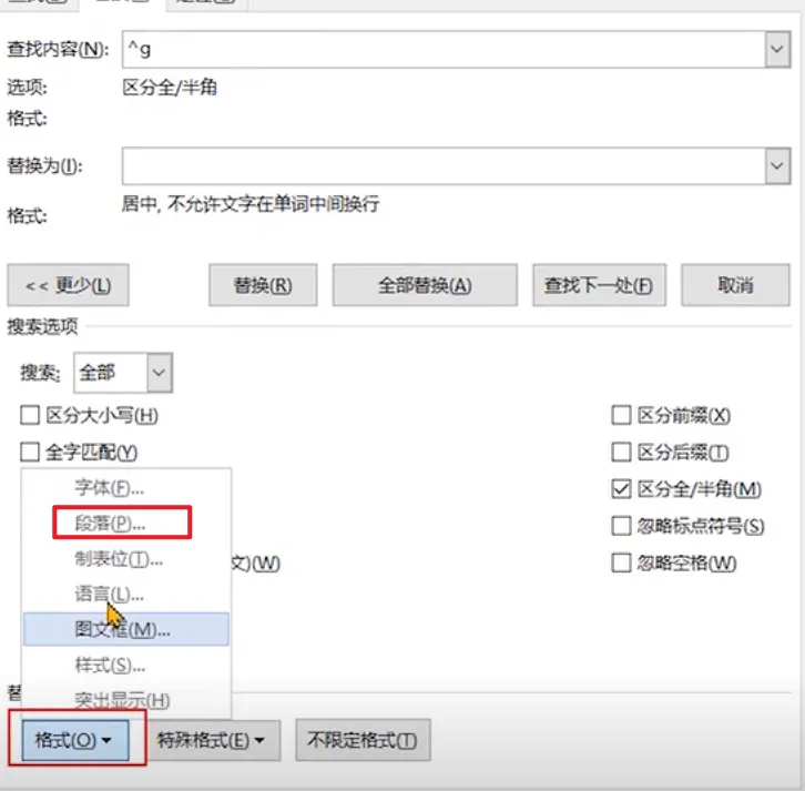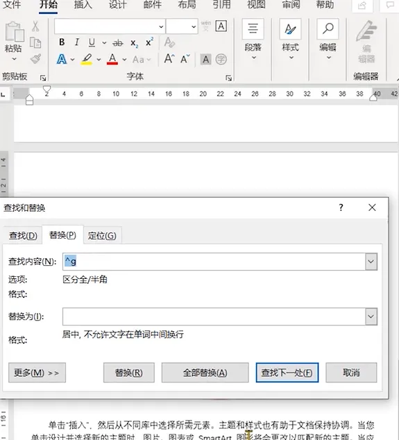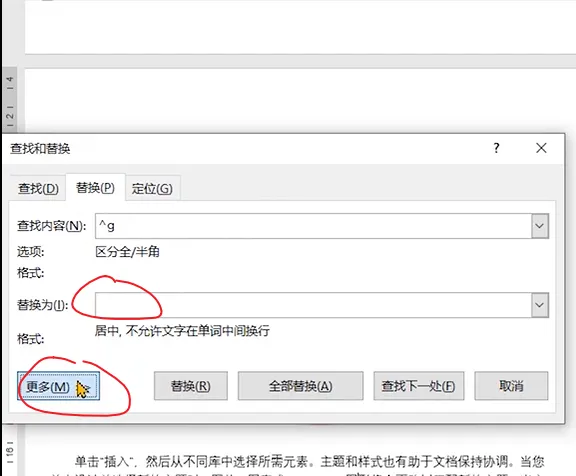 查找内容输入【^g】指代所有的图片,选后点击【替换为】的输入框,点击更多。