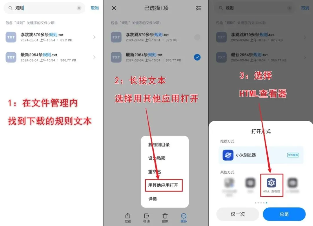 第一步:下载好规则文件,在本地文件夹内找到文件,长按选择用其他应用打开,再选择HTML查看器打开;