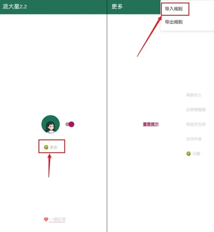 第三步:打开李跳跳APP,点击更多,再点击右上角,选择导入规则;