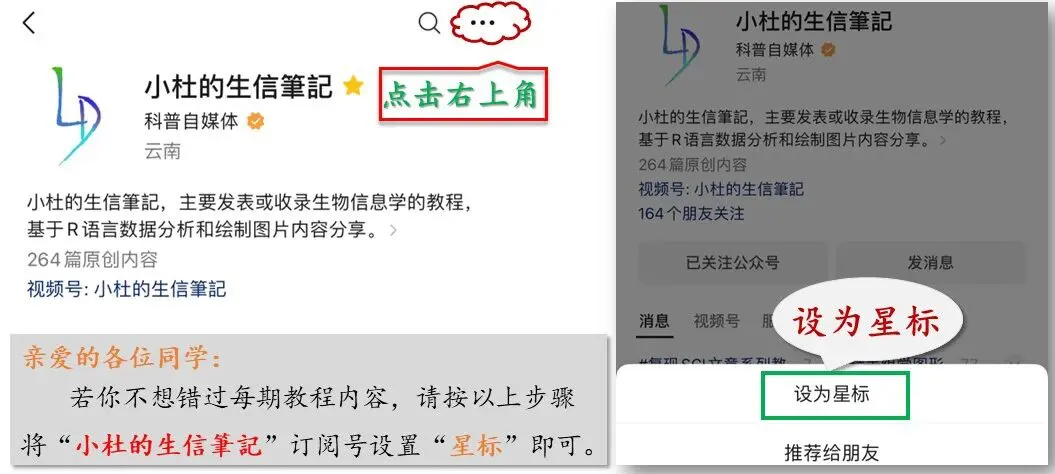 「一边学习,一边总结,一边分享!」由于微信改版,一直有同学存在长时间接收不到公众号的推文。那么请跟随以下步骤,将「小杜的生信筆記」设置为「星标」,不错过每一条推文教程。