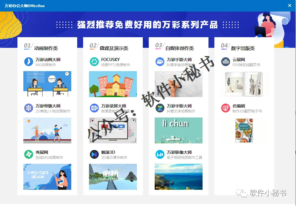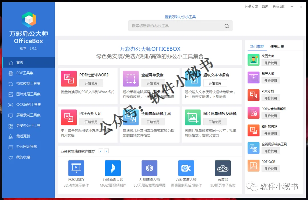 包含60+个无任何广告及插件的办公小工具,所有的小工具无需安装,直接加载启动,从此省去到处寻找工具、安装及卸载的麻烦。