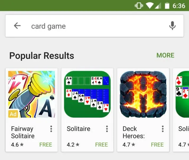 小编查询发现,目前谷歌在Google Play商店中已经采取了这种做法。比如当用户索索“纸牌游戏”或“动作游戏”时,会首先显示广告位,并且优先于其它搜索结果。