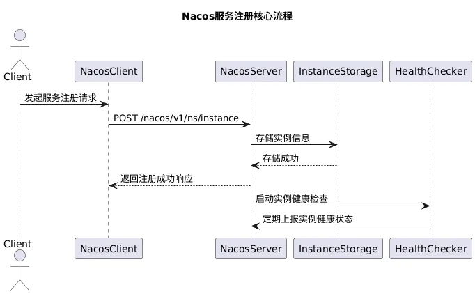 要理解服务注册失败的原因,首先需要深入了解Nacos的服务注册核心流程。Nacos的服务注册主要分为客户端发起注册请求、服务端处理请求并存储实例信息、以及后续的健康检查三个阶段。