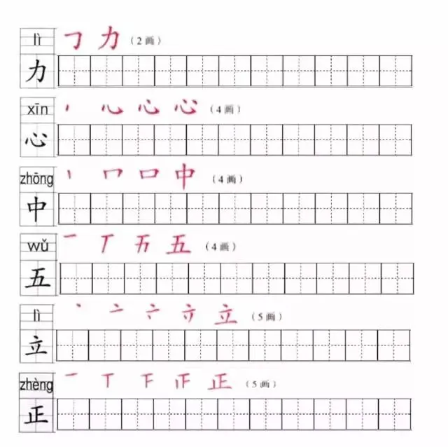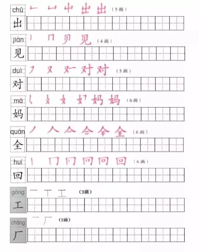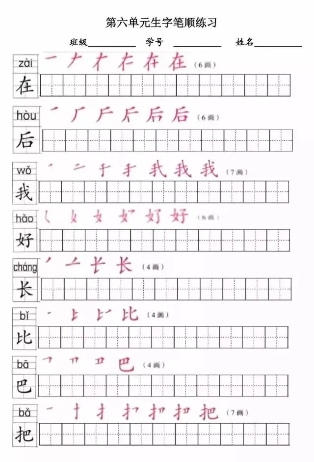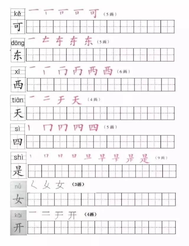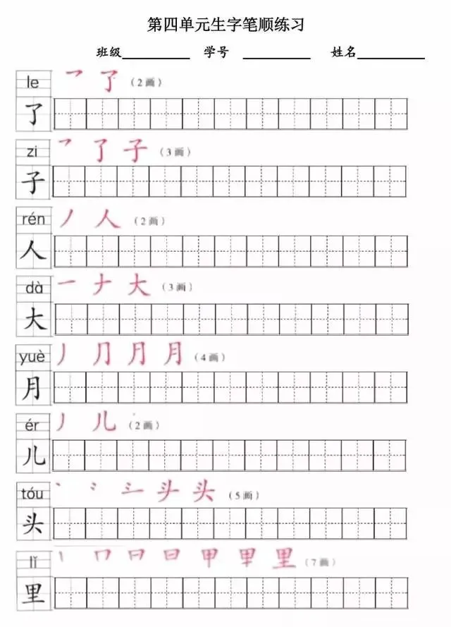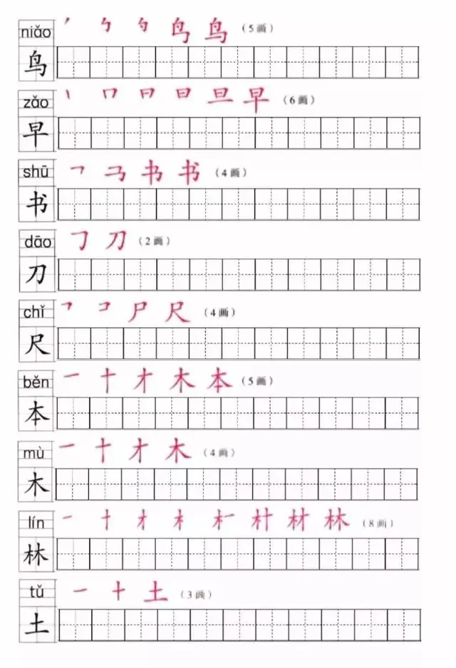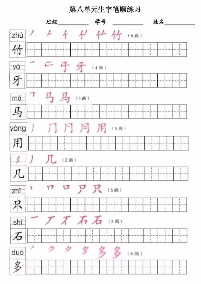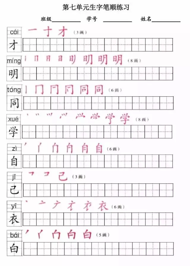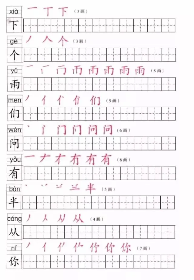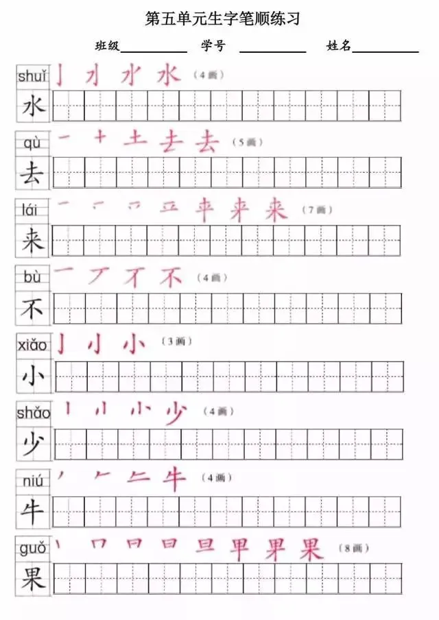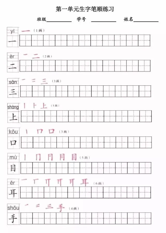 部编版一年级上册1~8单元写字表笔顺练习(可打印下载)