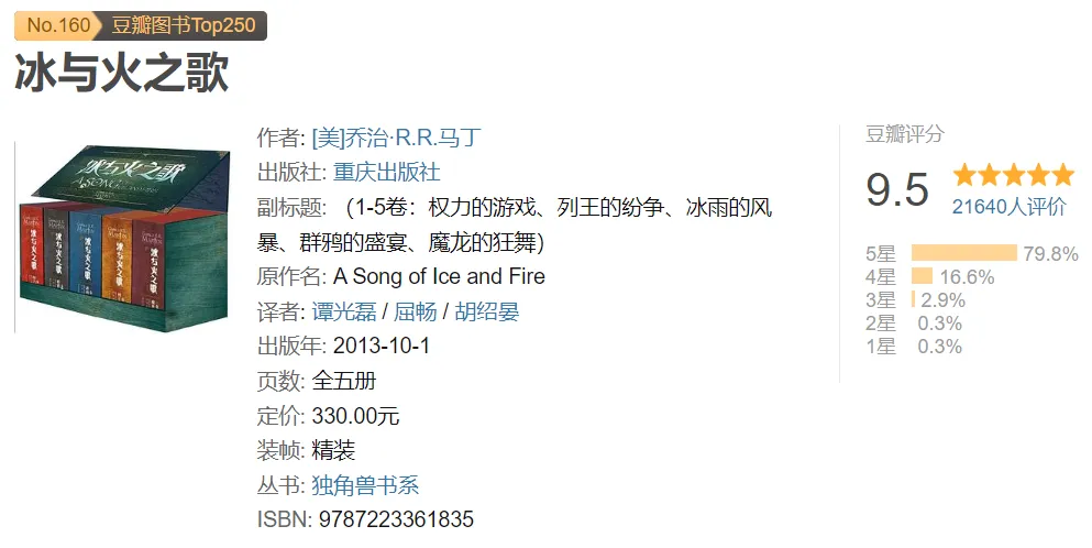 《冰与火之歌1-5卷》pdf+epub+mobi+azw3电子书下载 《冰与火之歌1-5卷》电子版下载链接,点击文章末尾左下方“阅读原文”自动跳转。 《权力的游戏》、《列王的纷争》、《冰雨的风暴》、《群鸦的盛宴》、《魔龙的狂舞》 代找电子书加微:350775395,加微备注领取电子资料可免费领取20T电子资料合集(古籍/电子书/小说/游戏/软件工具/电影/电视剧/动漫/PPT素材/教辅资料/烹饪教程/各类学习文档等电子资源)。 特别提醒:电子资料仅供个人学习使用,链接随时失效,请及时保存到个人网盘!