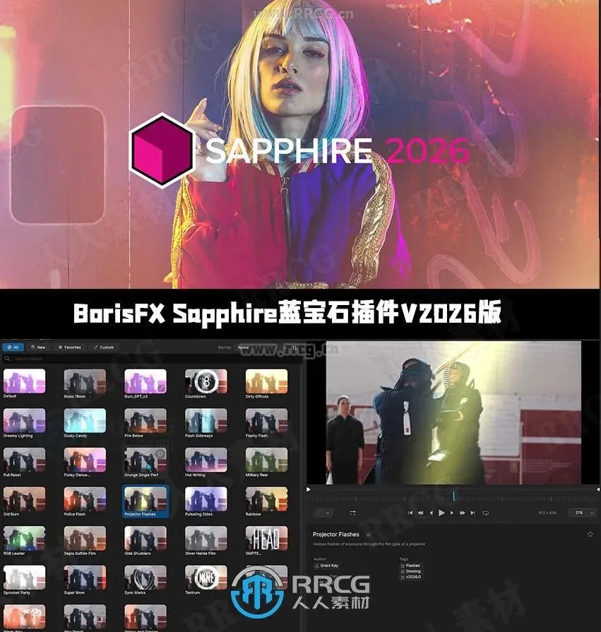 本插件是关于BorisFX Sapphire蓝宝石插件V2026.01版,大小:5.4 GB,支持AE与PS和其他OFX通用软件,支持Win64位系统,语言:英语。人人CG分享蓝宝石插件Genarts Sapphire是一款由Boris FX公司开发的AE插件包,专为图像处理和合成效果定制,更新支持After Effects CC,Sapphire是视觉特效插件套件的一个重大升级。关键功能包括整合奥斯卡奖Mocha平面跟踪和遮罩引擎成蓝宝石效果。 分为几大类:照明、风格化、变形、过度锐化,添加过渡转场效果,除了添加Mocha,可以使用Sapphire Builder创建超过50个新的效果和过渡。Autodesk Flame 艺术家将从独家s_mocha火花增加效益,允许输出Mocha平面跟踪数据,用于其他火焰合成模块。最后,正如每一个主要版本,蓝宝石已优化为最大的CPU和GPU的性能。