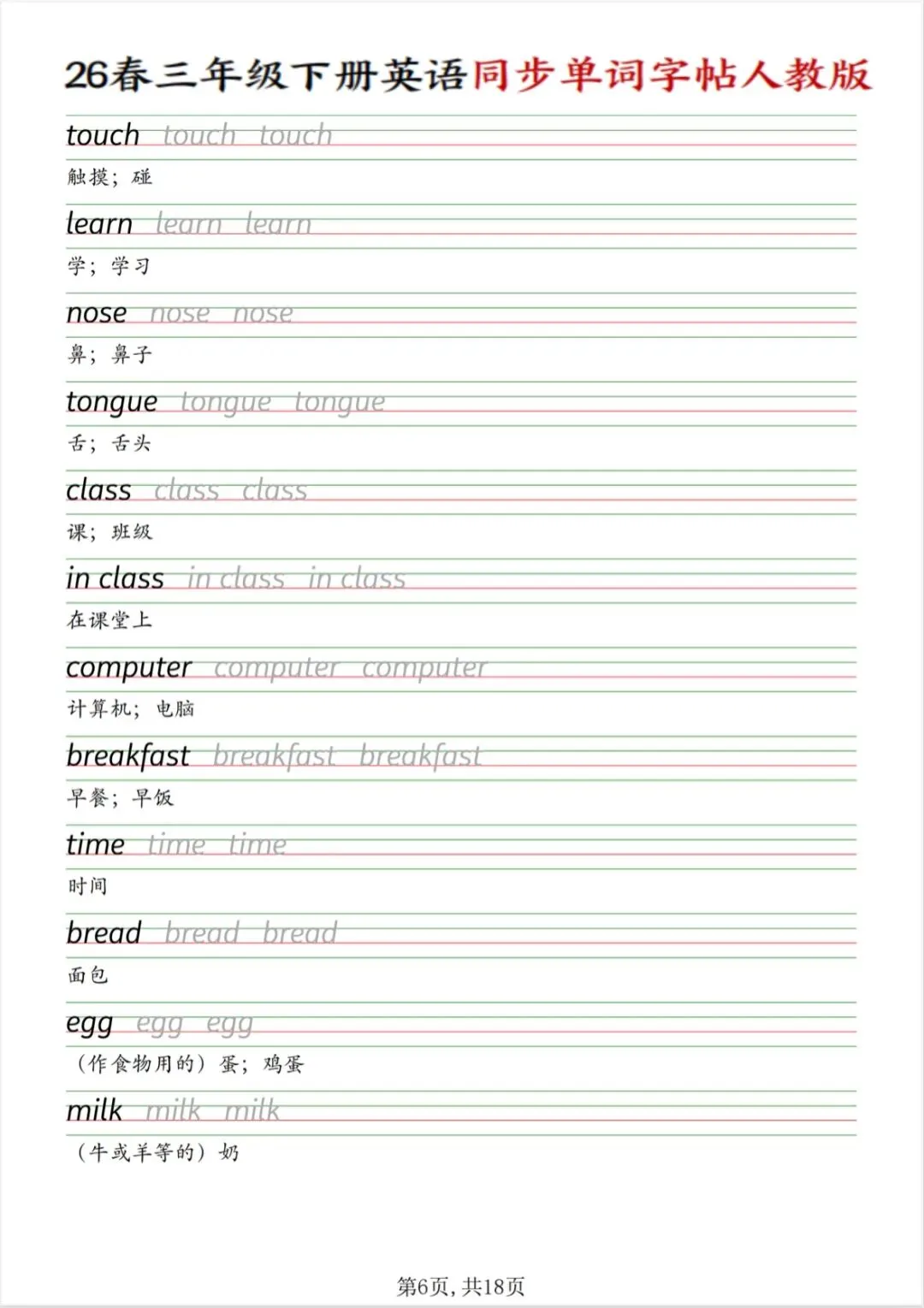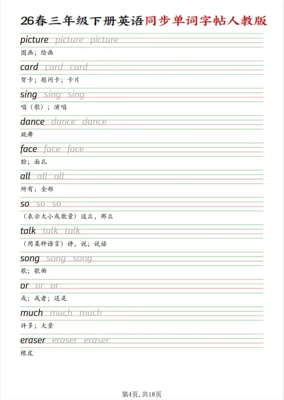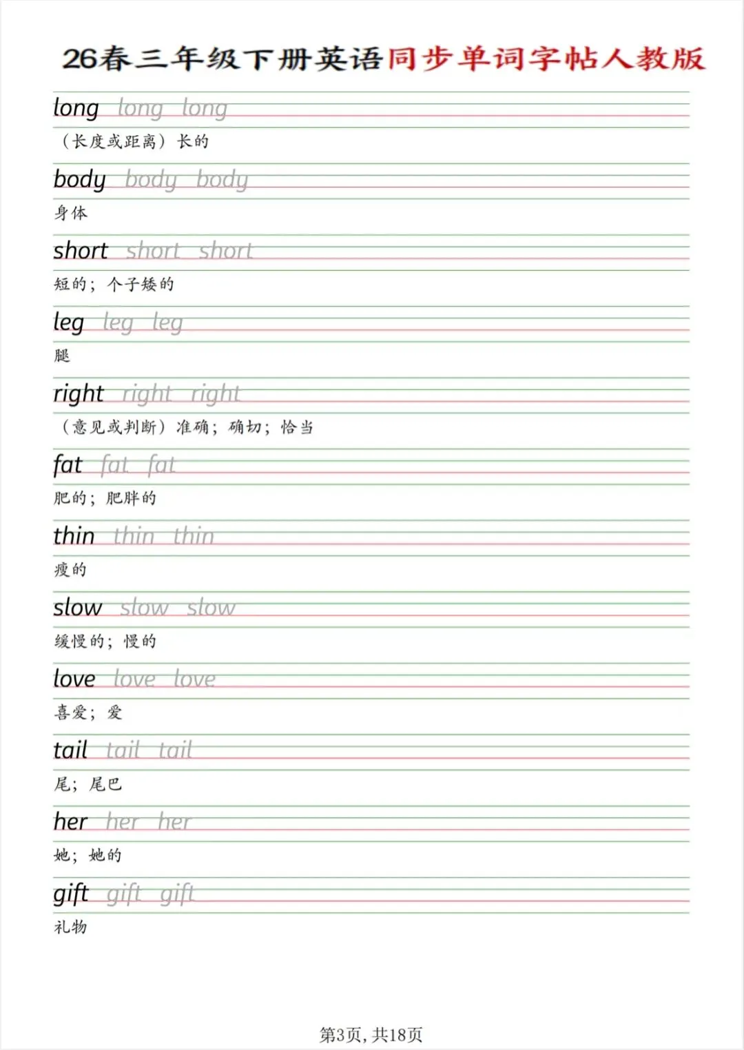 三年级下册英语同步单词字帖(人教版PDF电子版),电子版可打印