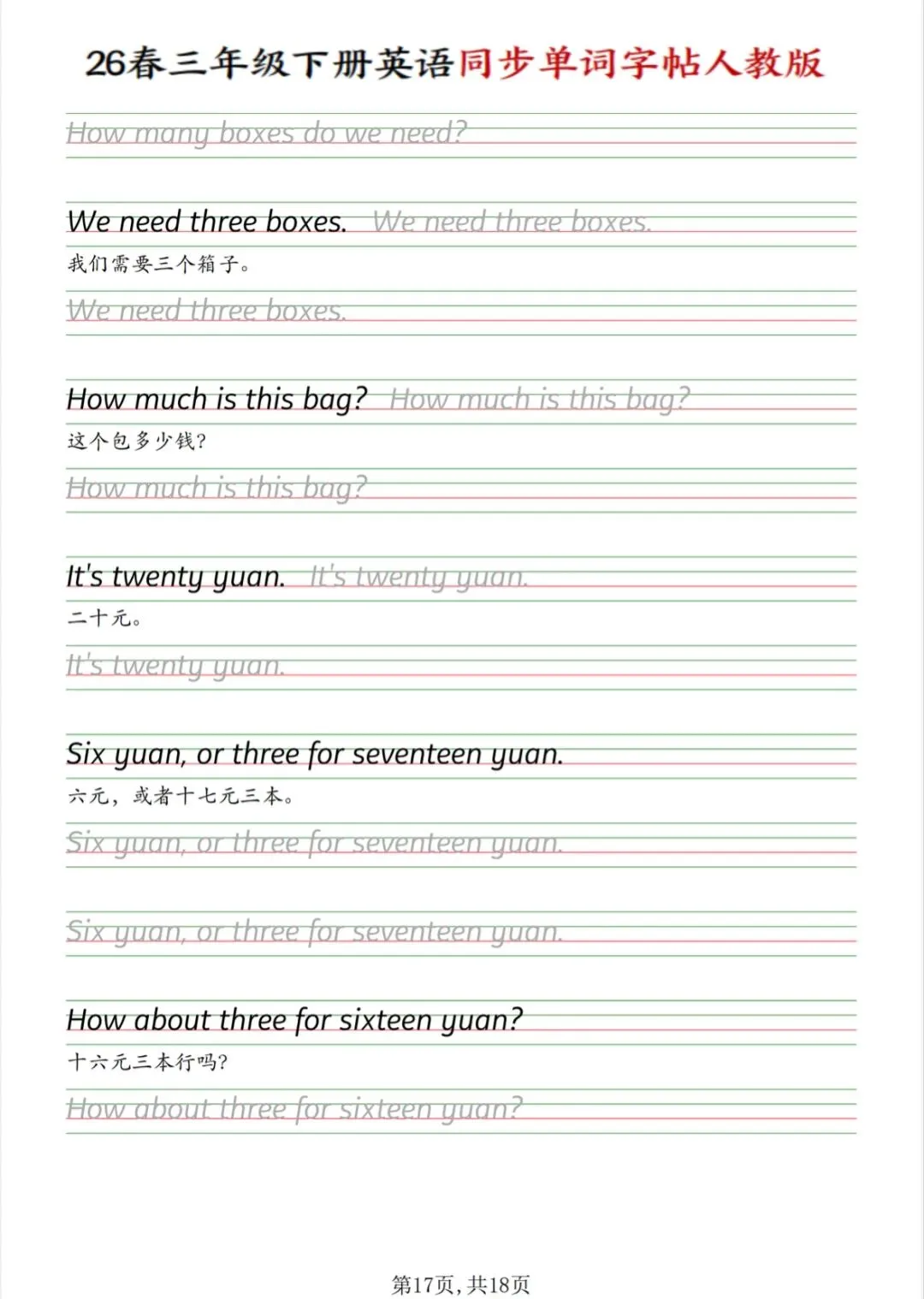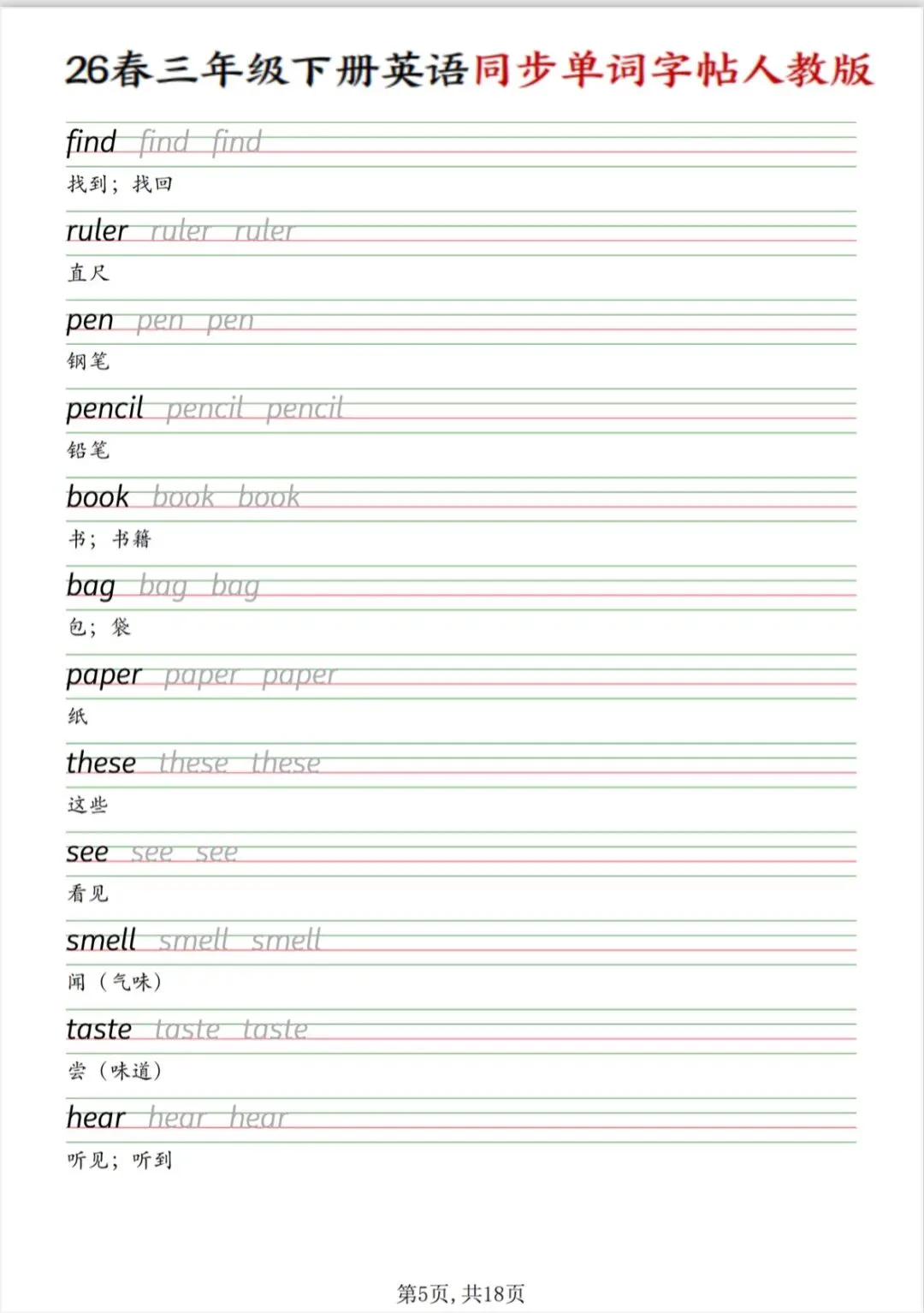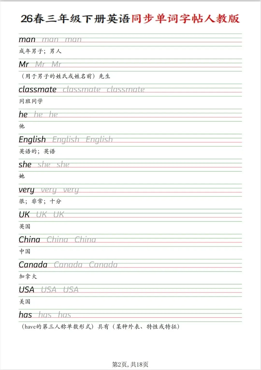 三年级下册英语同步单词字帖(人教版PDF电子版),电子版可打印