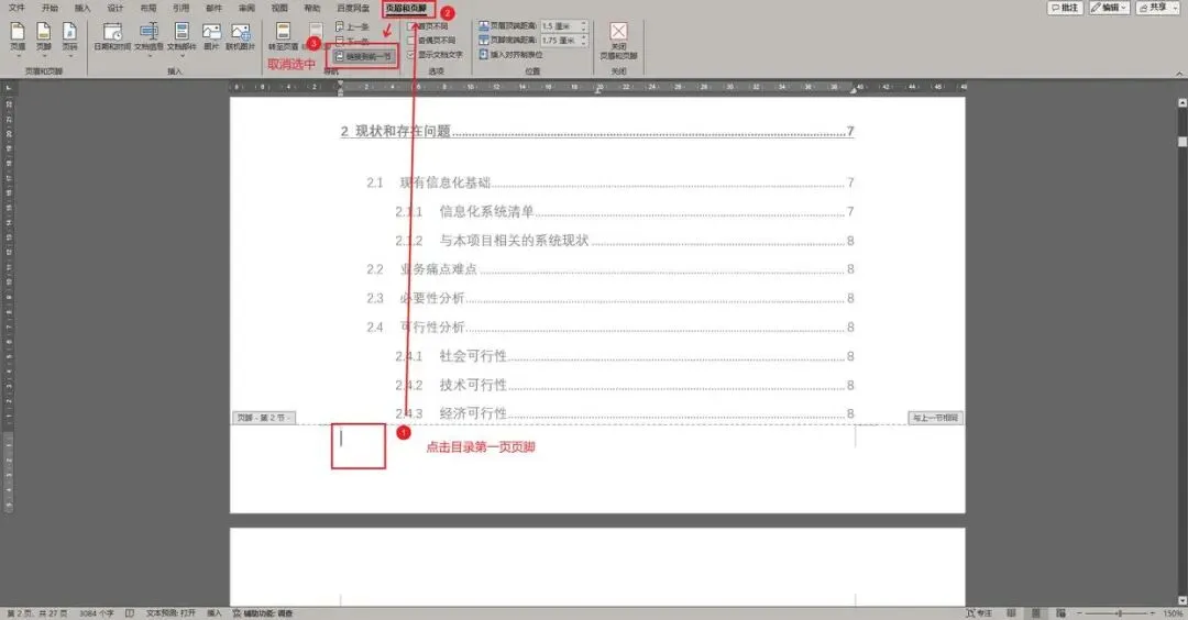 同理,将目录第一页页脚取消选中“链接到前一节”。
