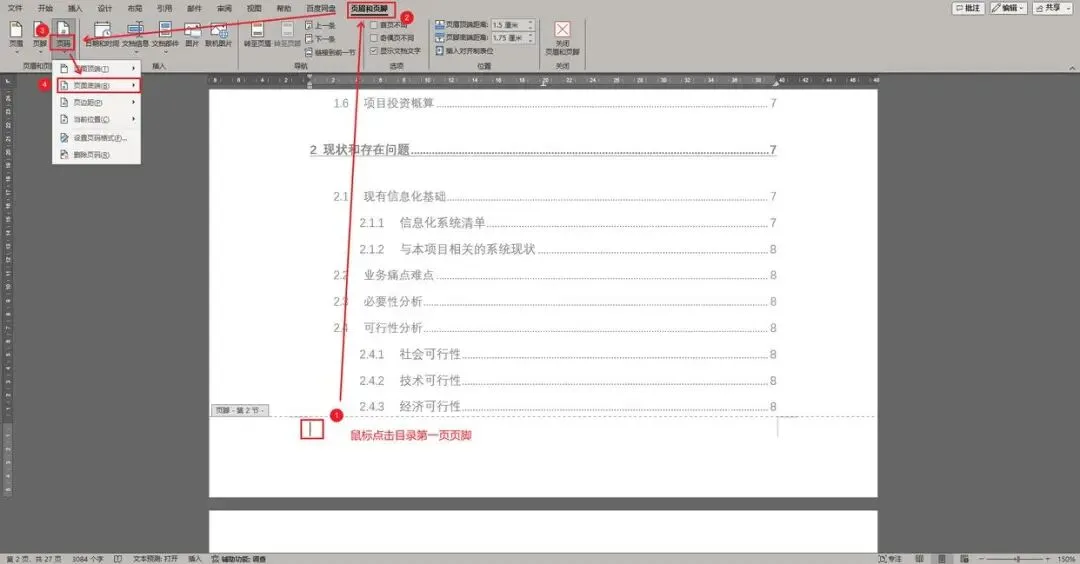 鼠标点击目录页第一页页脚,在“页眉和页脚”菜单中,选择页码,点击页码样式完成插入。