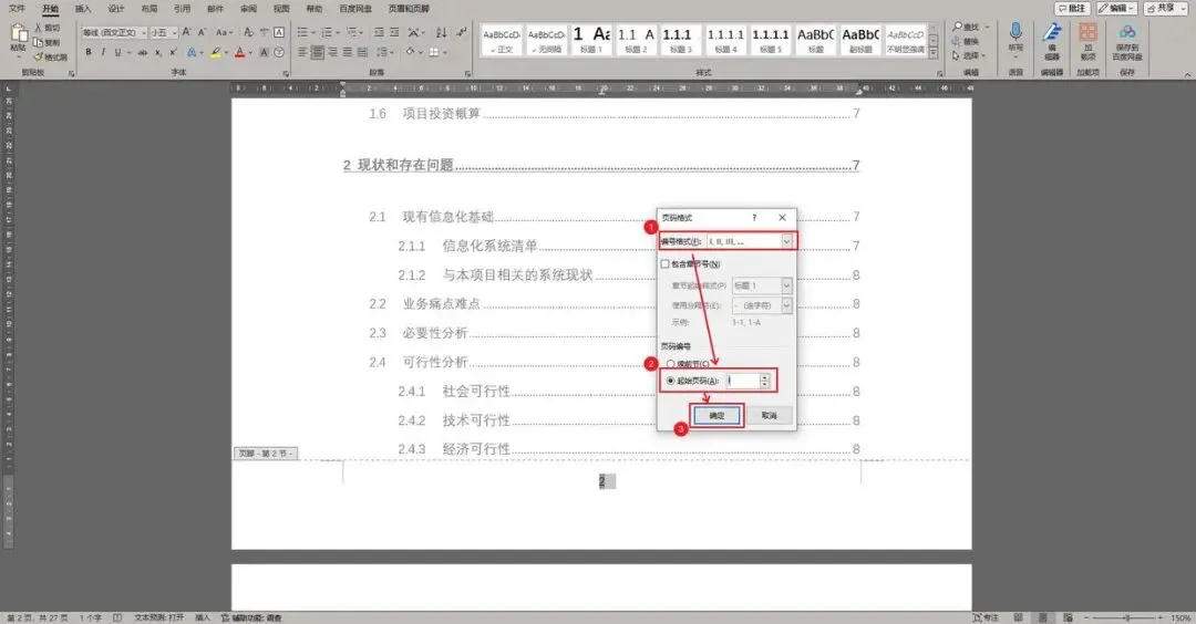 在页码格式选项卡中,将编号格式改为罗马数字(或其他格式),选择“起始页码”,将值修改为“Ⅰ”,点击确定。