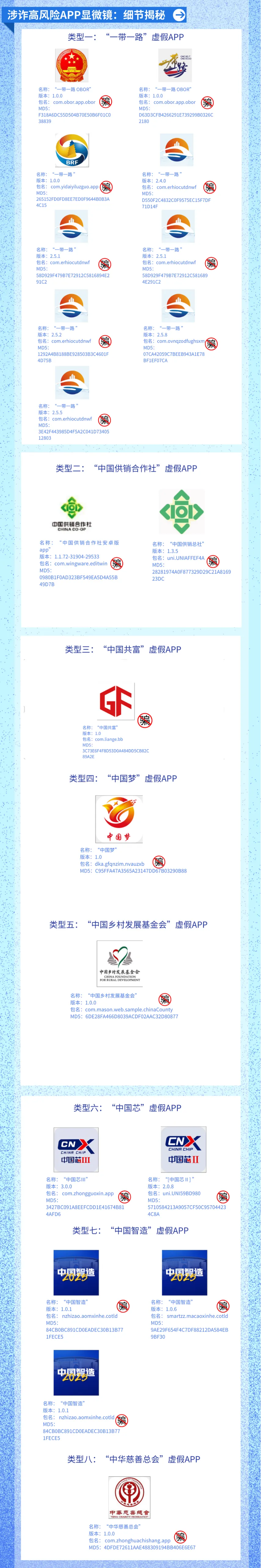 近日,工信部反诈专班公布了一批涉诈高风险APP,一些不法分子套用各类官方公开信息,打着“国家支持项目”“国家惠民政策”旗号,制作出一大批涉诈APP,在其中编造虚假投资理财项目,以高收益为诱饵,忽悠不明真相的群众在APP进行“投资”,进而实施诈骗。