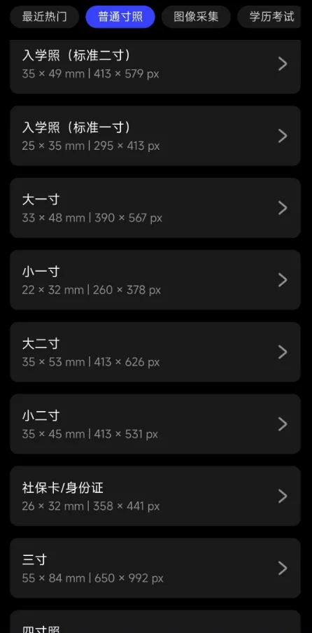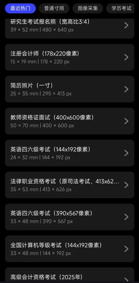 ✅ 多规格支持:覆盖身份证、护照、驾照、毕业证等百余种证件照规格 -