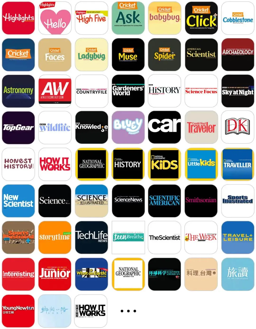 Highlights、Highlights Hello、Highlights High Five、Ask、Babybug、Click、Cobblestone、Cricket、Faces、Ladybug、Muse、Spider、100% Wow、AirForces Monthly、Al l About space、American Scientist、Archaeology、Astronomy、Athletic weekly、BBC Countryfile、BBC Gardeners World、BBC History、BBC Knowledge、BBC science Focus、BBC Sky at Night、BBC Top Gear、BBC Wildlife、BBC 知识、Bluey、Brainspace、Car、Computeractive、Conde Nast Traveler、Cuddles、DK、Eco Kids、Evo、Gadgets、Girls’ World、Go Girl、How lt Works、It GiRL、MiniMag、National Geographic、National Geographic History、National Geographic Kids、National Geographic Little Kids、National Geographic Traveller、NewScientist、ROVA、Science、Science illustrated、Science News、Scientific American、Smithsonian、Sports Illustrated、Sports Illustrated Kids、Storytime、Stuff、T3、Techlife News、Teen Breathe、The Scientist、The Week Junior、Travel+Leisure、Unicorn Universe、Very Interesting、Very Interesting Junior、What Doctors Don’t Tell You、What on Earth、Who Do You Think You Are、World Soccer、国家地理、环球科学、料理台湾、旅读、旅人志、妈妈宝宝、少年牛顿、乡间小路、知识大图解、知识就是力量等……