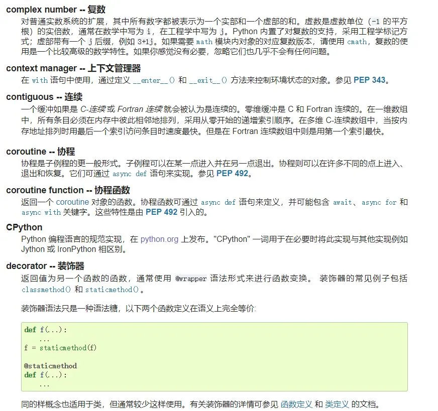 最后,Python 中文文档还有个小彩蛋,它把 Python 中的术语都翻了一遍。很多时候,这些术语都有不同的译文与表达方式,例如 decorator 既可以保留原文,也可以翻成装饰器或修饰器。也许以后,这一份官方词汇表可以帮助我们找到更合适的表达方式。