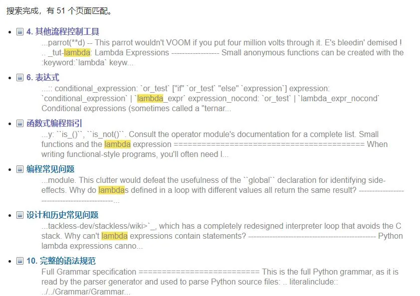 可能对大多数开发者而言,检索 Python 的函数或用法是文档的常用方法。例如如果我们希望找到函数式编程的使用方法,那么可以在中文文档中搜索 Lambda: