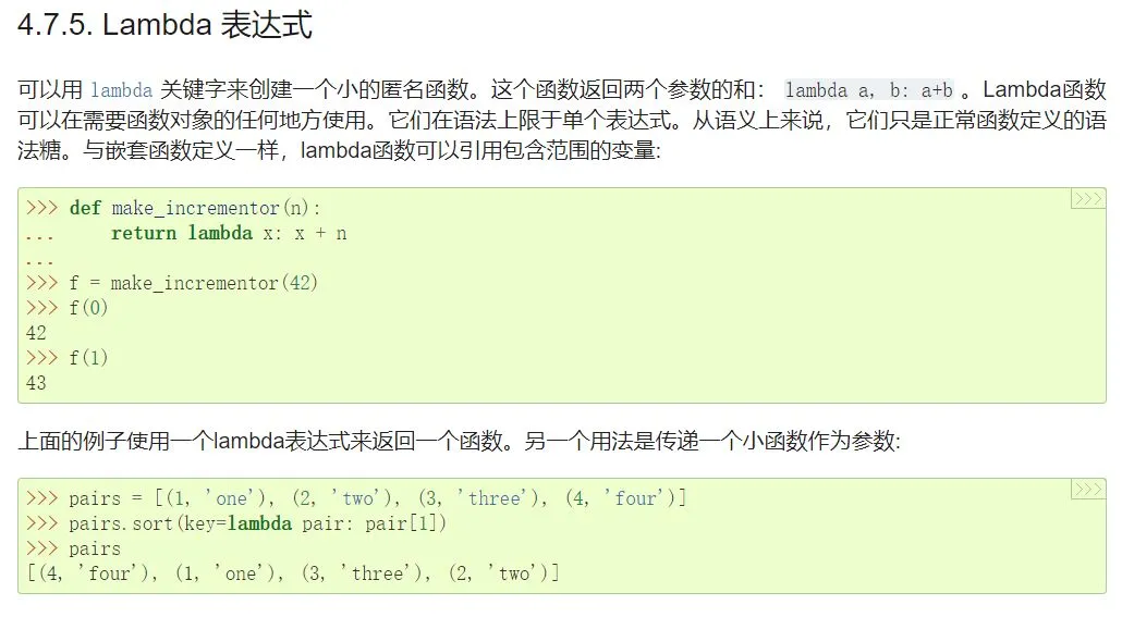 其中流程控制工具有匿名函数 Lambda 的使用简介,而重要的函数式编程指引暂时只有一小部分完成翻译。如下展示的是检索到的 Lambda 使用指南。