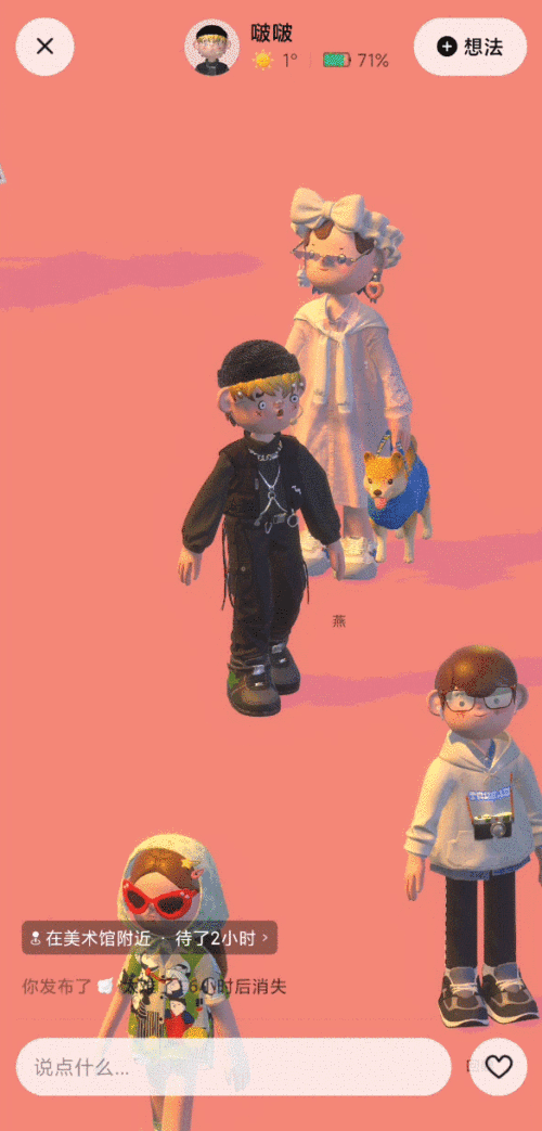 刚进入啫喱的他们新鲜感十足,赴约之前,就开始在啫喱上互相同步动态和计划,也会根据实际情况更换自己的动态,睡觉、刷剧、打游戏、搬砖,一看虚拟形象,就能看到每个人在做什么。过去交流的微信群被晾到了一边。