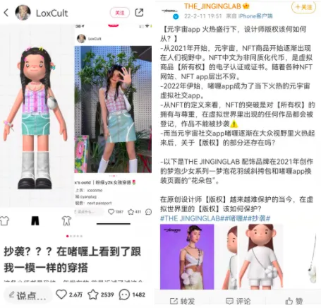 被认为可圈可点的人物形象和画风,也被多方质疑“虚拟穿搭抄袭”。有博主表示,啫喱中出现了和自己过去笔记中一模一样的穿搭。也有配饰品牌发文表示,在啫喱里看到了和去年自己品牌创作的一款斜挎包非常相似的花朵包。