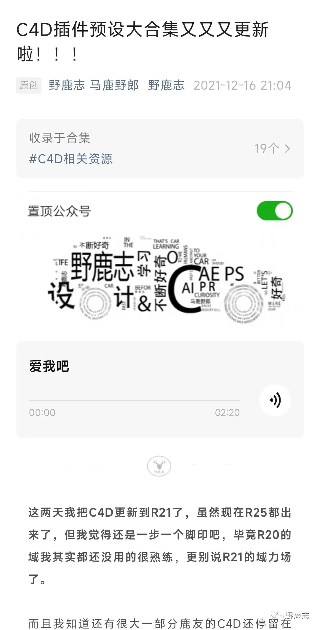 考虑到应该有不少鹿友的C4D也还是老的版本,所以老的插件预设合集的获取链接我并没有删除,大家可以根据自己的需求在公众号后台对话框回复对应的数字获取。