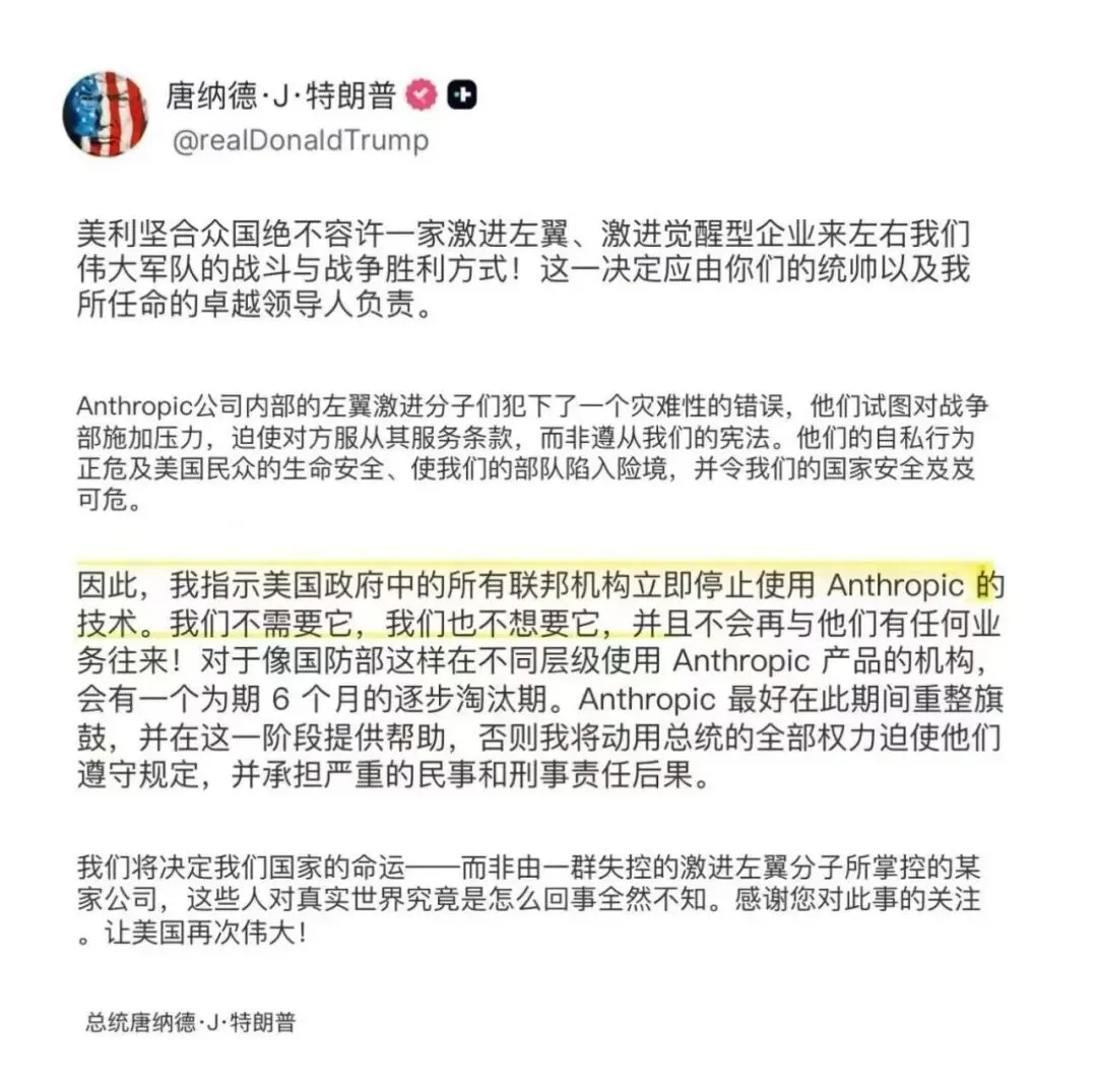 2月27日下午4点,特朗普在五角大楼截止时间约一小时前,率先在Truth Social发文,下令所有联邦机构立即停止使用Anthropic技术,同时给予六个月过渡期。
