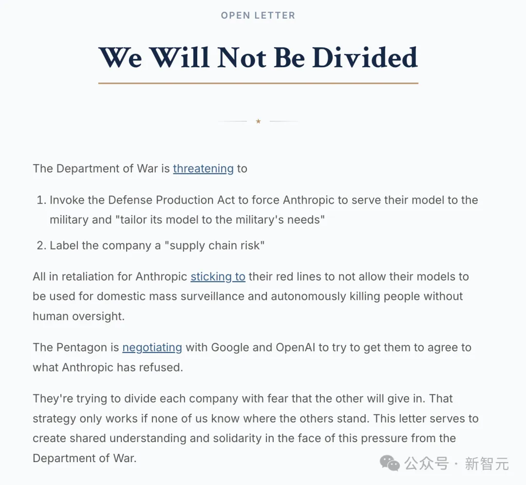 信中,他们明确表示——我们诚挚地希望,公司领导层能够暂时放下彼此竞争的分歧,团结一心。请继续顶住压力,坚决拒绝战争部目前提出的无理要求,即索要权限将我们的模型用于国内大规模监控,或在缺乏人工监管的情况下自主剥夺生命。