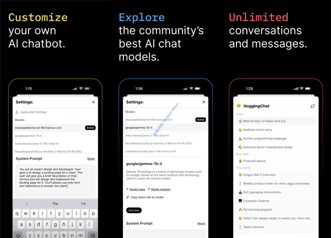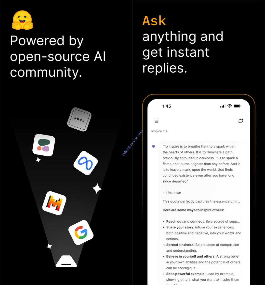 这还不够,今天 Hugging Face 推出了 iOS 版 Hugging Chat 应用,让用户可以在手机上也使用这些模型,因此在 OPENAI ChatGPT、Microsoft Copilot 和 Google Gemini 之外,你有更多选择。