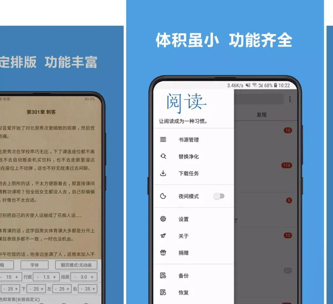 精致排版、护眼模式、极简模式、亮度自适应、多样独特的阅读页主题,每一个阅读姿势都舒服