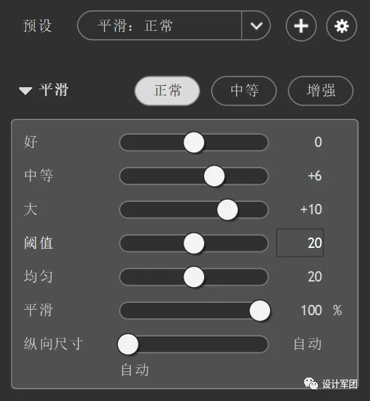 Portraiture 提供了3种磨皮预设强度,分别是“正常”、“中等”、“增强”,你可以根据需要选择不同的磨皮强度,可任意切换这三种磨皮强度,来查看磨皮的效果。