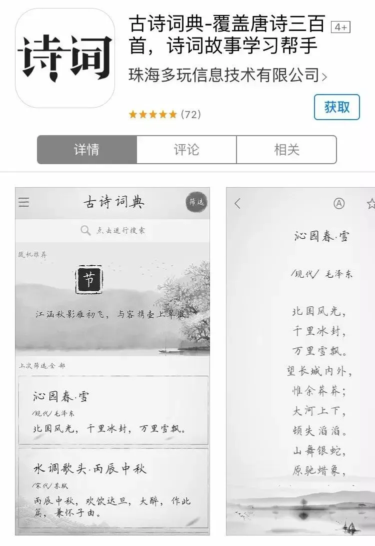 @H2O:雅君雅君,看到有人推荐朗读诗词的app,我也要推荐一个,就叫“诗词”,古风背景和字体,唐诗宋词元曲古文应有尽有,还可以下载翻译包、赏析包、注解包,支持离线下载,朗读的古筝配乐也很好听,没有乱七八糟的广告,实乃良心之作,不可多得矣。