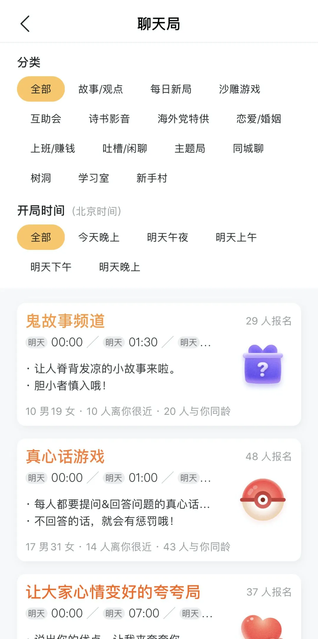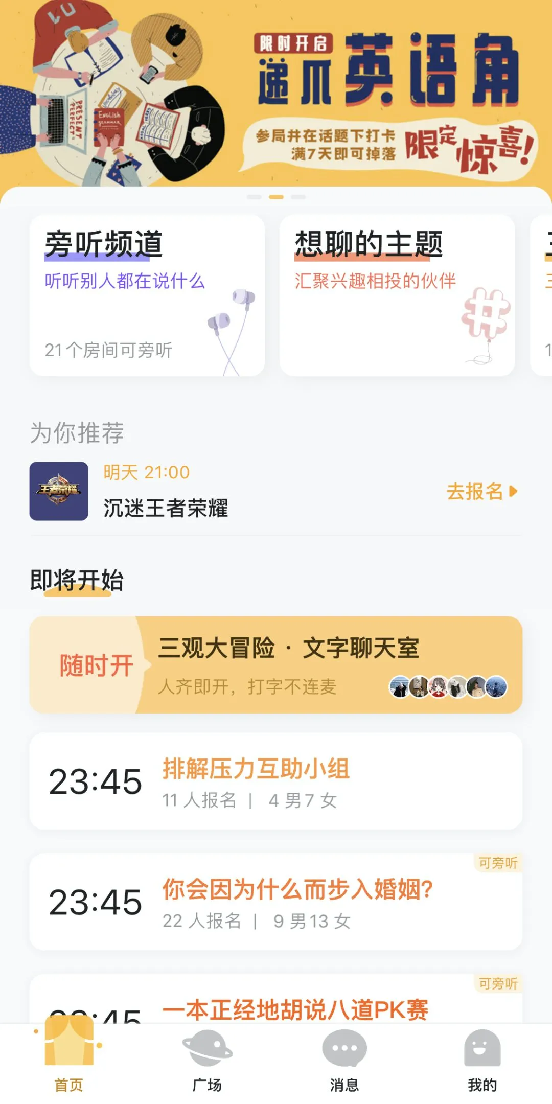 当然啦,作为一个关爱社畜的社交APP,我们还有许多社畜友好的聊天局,帮大家调节心情,增益技巧,和工作和谐共处👇