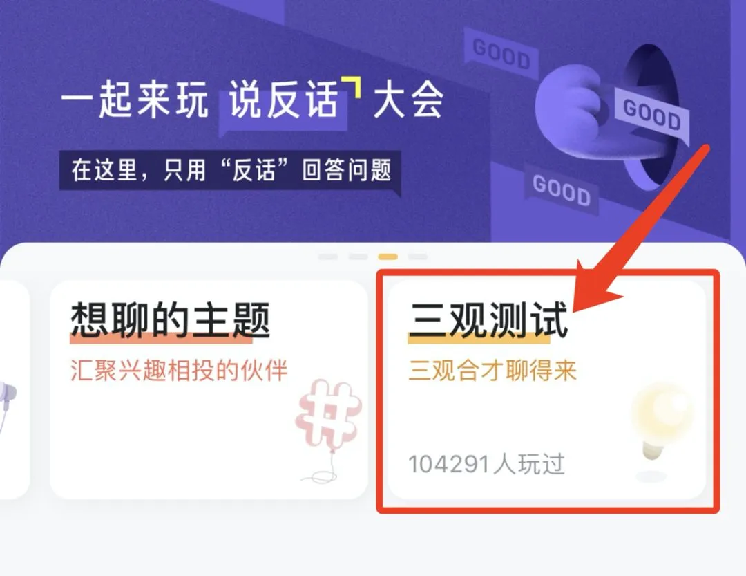 我们相信,做完这套超级无敌有趣的三观测试题之后,你一定想找人聊一聊题目和答案。这时候,你可以在首页找到“聊聊你的三观测试”聊天局,和小伙伴们开始一场三观碰撞👇