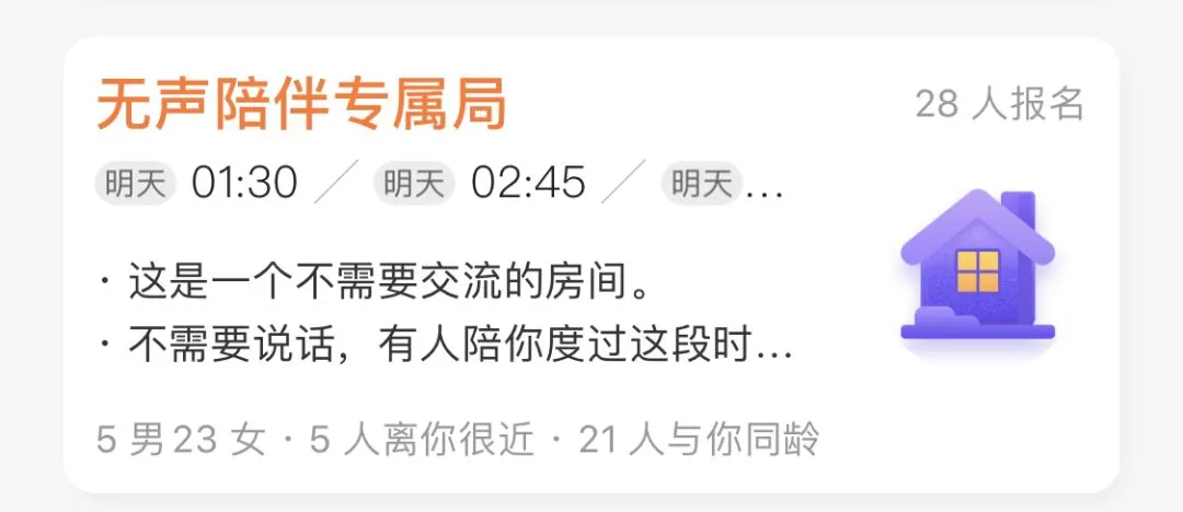有些时候,你也不知道要说什么,但就是想找人陪陪自己,那么建议打开“无声陪伴局”,所有人闭麦但在线,没人说话,但你知道这段时间的你,并不孤独👇